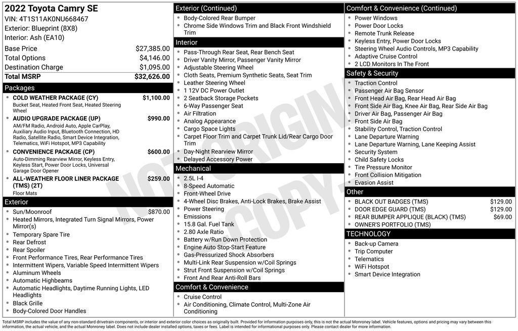 - Vehicle Name: Toyota Camry