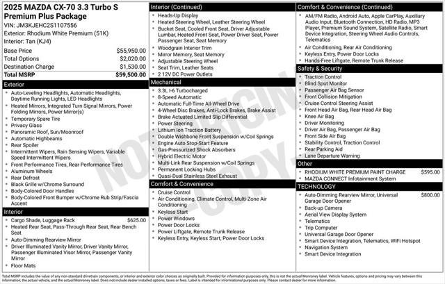 Rhodium White Premium 3.3 Turbo S Premium Plus AWD 8-Speed Automatic I6 Turbo Sunroof / Moonroof, Back Up Camera, Bluetooth®, 12 Speakers, 4-Wheel Disc Brakes, ABS brakes, Auto High-beam Headlights, Auto-dimming door mirrors, Automatic temperature control, Brake assist, Dual front impact airbags, Dual front side impact airbags, E911 Automatic Emergency Notification, Electronic Stability Control, Emergency communication system: MAZDA CONNECT, Four wheel independent suspension, Front anti-roll bar, Front Center Armrest w/Storage, Front dual zone A/C, Fully automatic headlights, Heads-Up Display, Heated door mirrors, Heated rear seats, Heated steering wheel, Heated/Ventilated Front Bucket Seats, Knee airbag, Low tire pressure warning, Mazda Connected Services, Mazda Online Navigation, Memory seat, Navigation system: MAZDA CONNECT, Occupant sensing airbag, Overhead airbag, Power door mirrors, Power Liftgate, Power moonroof, Radio: AM/FM w/Bose Premium Audio Sound System, Rain sensing wipers, Rear air conditioning, Rear anti-roll bar, Rear window defroster, Rear window wiper, Remote keyless entry, Security system, Speed control, Speed-sensing steering, Split folding rear seat, Steering wheel memory, Steering wheel mounted audio controls, Telescoping steering wheel, Tilt steering wheel, Traction control, Variably intermittent wipers, Wheels: 21 x 9.5J Aluminum Alloy.
